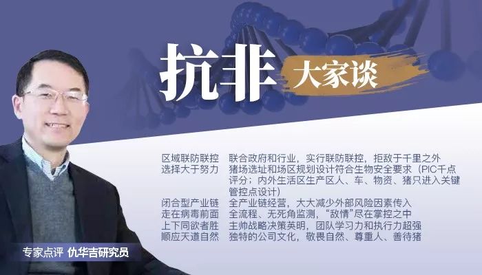 公司关于非洲猪瘟防控指导原则:(1)我们只有生物安全这一个武器,没有其它武器,也永远不要去考虑其它武器的事,这让整个团队明白唯有依靠生物安全,没有其它退路。因为只有坚持走高健康管理路线,强化生物安全和营养,弱化不必要的免疫保建,才能让猪的潜能得到充分的发挥,健康和高效才是未来养猪的核心竞争力。(2)“与非洲猪瘟赛跑”,非洲猪瘟迟早会来到我们面前,但要在它来到我们身边之前,把所有对付“它”的武器准备好,准备充足,包括能干掉“它”的冷静应对的团队心态,即使是进入巷战阶段,有了充足的准备,也能为打赢巷战奠定强有力的基础。