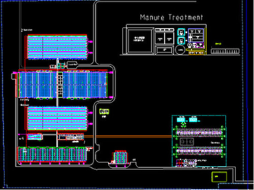 环保区位于场区下风向、低洼位置,需要有固态废弃物处理区、液态废弃物处理区和死猪无害化处理区(图8)。固态废弃物处理区,建议采用密闭式阳光棚或大棚进行堆积发酵,也可以采用立式发酵罐进行发酵处理。液态废弃物处理主要是通过厌氧发酵、好氧发酵、两级OA、末端深度处理,然后排入生物氧化塘。死猪无害化处理采用电热式高温发酵设备,快速高温分解死猪,短时间快速杀灭细菌和病毒。整个环保区尽量与生产区拉开距离,并且有镀锌围网进行分隔,有专用的进出道路。