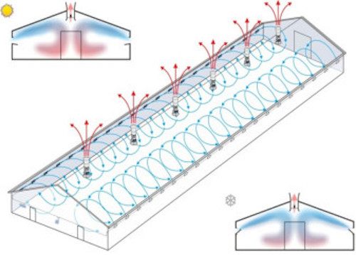 采取的通风模式之一。为了降低猪舍内的有害气体、粉尘等杂质的传播,猪栏实心隔墙越来越多,横向的水平通风的设计模式(图4)将对生产造成严重的影响。垂直通风模式、吊顶小窗垂直通风模式、风管垂直通风模式、弥散通风模式,将会成为规模场的首选。同时,出风的方式也很重要,屋顶出风或者废弃收集除臭装置也是通风系统中重要的一个环节。进风口的空气过滤装置,也是有效阻断蚊蝇、粉尘和大颗粒物质有效的方法。根据猪舍的类别、生物安全等级要求可以选择安装初效、中效、甚至是高效空气过滤装置。没有安装空气过滤装置的通风系统,需要在屋檐进风口、水帘外侧安装304不锈钢丝网,钢丝网要求密度大于20目。