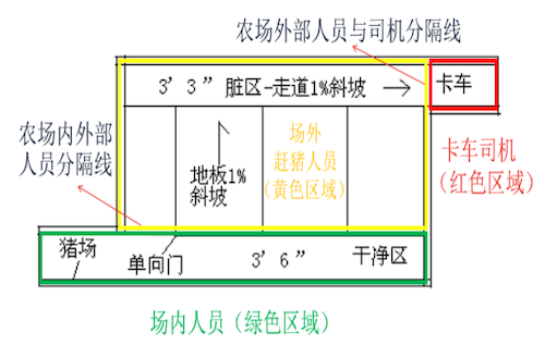 10km以上。卖猪中转站功能区:场内车辆卸猪台、场外车辆装猪台(升降平台或升降赶猪通道)、猪群暂存栏、污水收集池、设备间、车辆清洗点、人员值班房等。场内车辆卸猪台和场外车辆装猪台要有一定的距离,并且中间要用实心墙体进行隔断。场内卸猪台的地面高度高于场外车辆装猪平台,并且有一定的坡度。暂存栏根据卖猪的频率,设计暂存栏的面积和数量,尽量将同一批次销售猪只暂存在卖猪中转站。保证场内中转车和场外运猪车在时间、空间没有接触和交叉可能,并且中转栏为单向流动设计,确保猪只单向流动不回头。暂存栏需要有顶棚,确保夏季和雨天卖猪的可操作性。