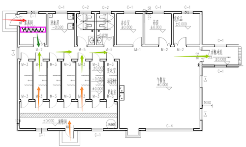 外生活区主要功能单元有行政办公、中央厨房、非生产人员宿舍等单元。中央厨房按照空间分为蔬菜采摘区、清洗区、配菜区、操作区和熟食暂存间等。按照餐食制作流程布置,要求分区管理。厨房操作人员与非生产区人员严格分开住宿,减少接触和交叉的风险。