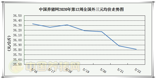 猪价系统数据显示,上周(2020年3月16日至2020年3月22日)全国生猪价格(外三元)震荡走跌,整体跌幅明显。周初全国外三元均价为36.33元/公斤,周末外三元均价为35.81元/公斤,上周外三元均价下跌幅度达到0.52元/公斤。