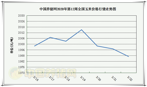 猪价系统数据显示,上周(2020年3月16日至2020年3月22日)玉米价格走势涨跌互现,但整体走势下跌。周初玉米价格均价为1998元/吨,周末玉米价格均价为1987元/吨,玉米均价下跌了11元/吨。