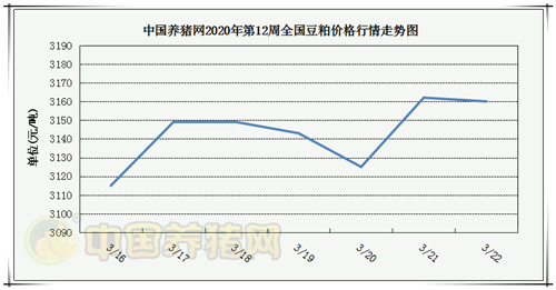 猪价系统数据显示,上周(2020年3月16日至2020年3月22日),豆粕价格震荡上涨。周初豆粕价格为3115元/吨,周末豆粕价格为3160元/吨,上周豆粕价格上涨了45元/吨。