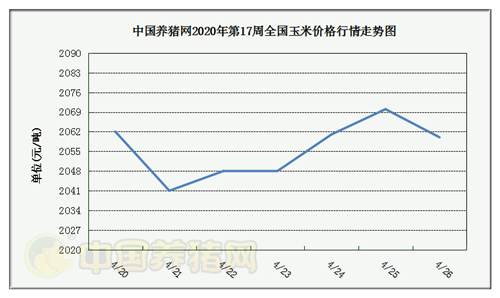 猪价系统数据显示,上周(2020年04月20日至2020年04月26日)玉米价格走势涨跌互现,全周“大涨大跌”局面常见,周初与周末价差不大。周初玉米价格均价为2062元/吨,周末玉米价格均价为2060元/吨,玉米均价下跌了2元/吨。