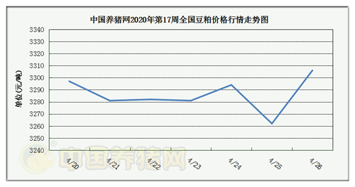 猪价系统数据显示,上周(2020年04月20日至2020年04月26日)豆粕价格震荡上涨,周末两天豆粕价格出现暴涨暴跌走势。周初豆粕价格为3297元/吨,周末豆粕价格为3306元/吨,上周豆粕价格上涨了9元/吨。