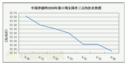 猪价系统数据显示,上周(2020年04月20日至2020年04月26日)全国生猪价格(外三元)稳步走跌,猪市行情持续低迷。周初猪价为33.62元/公斤,周末猪价为32.75元/公斤,上周猪价下跌了0.87元/公斤。