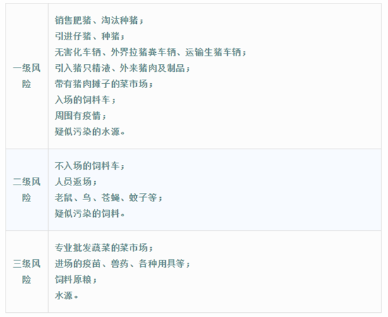 防控,简单来说就是一进一出的防控,严格入场的消毒,守住大门口;其次就是盯紧中转出猪台、销售出去的猪和流动的人,杜绝交叉和逆行,以免把非瘟病毒从中转出猪台带回猪舍,再传染给健康猪。做好生物安全措施,想尽一切办法不让非瘟病毒突破我们的生物安全防线,切断传播途径,防控就有了保障。我们梳理出了一些关乎复养成败的生物安全漏洞,并评估出了风险等级,供养猪同行参考(按照一级风险、二级风险、三级风险标识区分风险等级),提升重视程度。