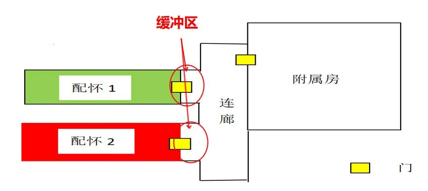 (2)对场内外区域、生产区内实行隔离(图3)。重新规划人流、物流通道,不同栋舍的人员、物资要从不同入口通道进入。人员及运送物资之间禁止交叉。各区域实行颜色管理,防止工具、物资交叉;