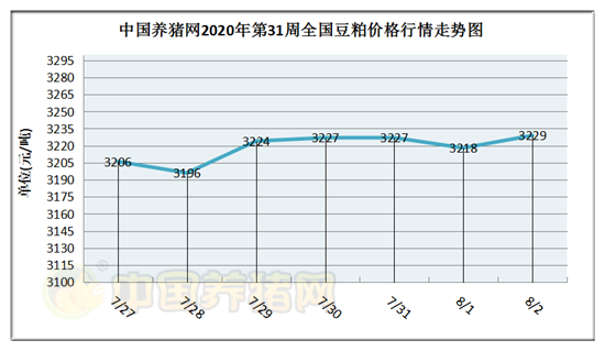 猪价系统数据监测,2020年第31周(2020年07月27日至2020年08月02日)豆粕价格呈现震荡走势,全周豆粕报价总体上涨,局部下跌!周初豆粕价格为3206元/吨,周末价格为3229元/吨,全周豆粕价格累计上涨了23元/吨。