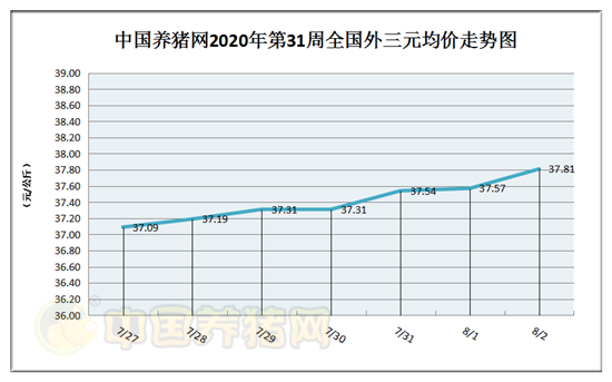 猪价系统数据监测,2020年第31周(2020年07月27日至2020年08月02日)全国生猪价格(外三元)稳步上涨,猪价行情在37.09-37.81元/公斤区间之内徘徊!周初猪价为37.09元/公斤,周末猪价为37.81元/公斤。全周猪价走势呈现稳中偏强运行,生猪均价涨幅有限!