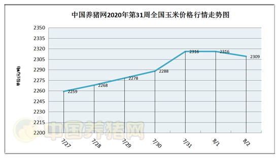 猪价系统数据监测,2020年第31周(2020年07月27日至2020年08月02日)玉米价格走势呈现“前涨后跌”局面,周初玉米价格为2259元/吨,周末价格为2309元/吨,全周玉米价格累计上涨了50元/吨。