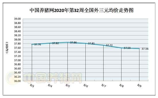 猪价系统数据监测,2020年第32周(2020年08月03日至2020年08月09日)全国生猪价格(外三元)章若楠个体偏弱运行,猪价行情在37.56-37.86元/公斤区间之内徘徊!周初猪价为37.76元/公斤,周末猪价为37.56元/公斤。全周猪价走势呈现稳中趋弱运行局面。