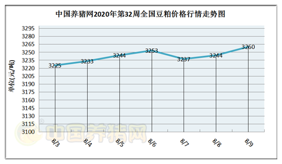 猪价系统数据监测,2020年第32周(2020年08月03日至2020年08月10日)豆粕价格呈现震荡走势,全周豆粕价格涨跌走势互现,整体涨幅比较平稳!周初豆粕价格为3225元/吨,周末价格为3260元/吨,全周豆粕价格累计上涨了35元/吨。