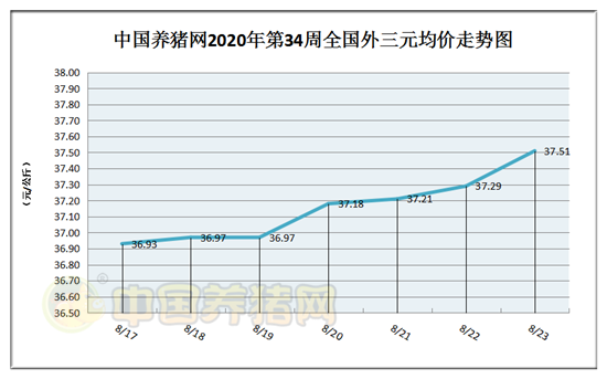 猪价系统数据监测,2020年第34周(2020年08月16日至2020年08月23日)全国呈现“阶梯式”上涨,猪价行情在36.93-37.51元/公斤区间之内徘徊!周初猪价为36.93元/公斤,周末猪价为37.51元/公斤,全周猪价累计上涨了0.53元/公斤。