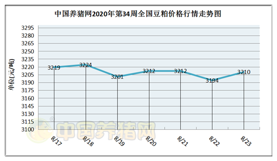 猪价系统数据监测,2020年第34周(2020年08月17日至2020年08月23日)豆粕价格整体行情偏稳,涨跌幅度均较小。周初豆粕价格为3219元/吨,周末价格为3210元/吨,全周豆粕价格累计下跌了9元/吨。