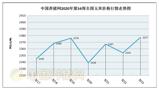 猪价系统数据监测,2020年第34周(2020年08月17日至2020年08月23日)玉米价格走势震荡运行,周初与周末玉米行情呈现上涨走势,周中有明显下跌。周初玉米价格为2345元/吨,周末价格为2377元/吨,全周玉米价格累计上涨了32元/吨。