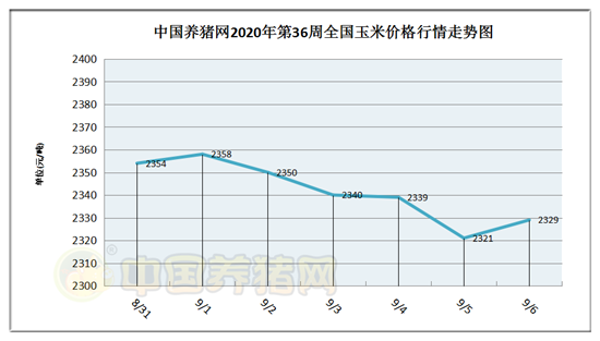 猪价系统数据监测,2020年第36周(2020年08月31日至2020年09月06日)元我国玉米价格稳步下跌,全周玉米价格区间在2321-2358元/吨,周初玉米价格为2354元/吨,周末价格为2329元/吨,全周玉米价格累计下跌了25元/吨。