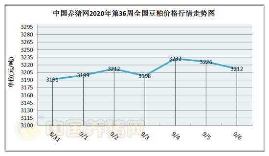 猪价系统数据监测,2020年第36周(2020年08月31日至2020年09月06日)本周豆粕价格走势震荡上涨,全国豆粕价格区间在3198--3232元/吨之间,周初豆粕价格为3191元/吨,周末价格为3212元/吨,全周豆粕价格累计上涨了21元/吨。