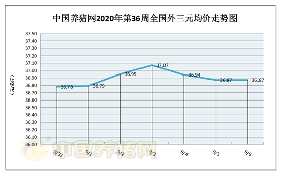 猪价系统数据监测,2020年第36周(2020年08月31日至2020年09月06日)全国猪价走势先涨后跌,猪价行情在36.78--37.07元/公斤区间之内徘徊!周初猪价为36.78元/公斤,周末猪价为36.87元/公斤,全周猪价累计上涨了0.09元/公斤。
