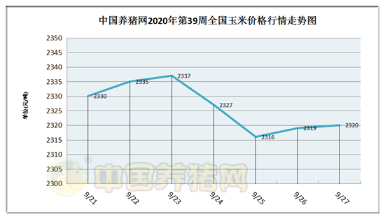 猪价系统数据监测,2020年第39周(2020年09月21日至2020年09月27日)我国玉米价格走势先涨后跌,全周玉米价格区间在2316-2337元/吨,周初玉米价格为2330元/吨,周末价格为2320元/吨,全周玉米价格累计下跌了10元/吨。