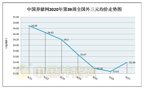 猪价系统数据监测,2020年第39周(2020年09月21日至2020年09月27日)全国猪价走势几乎全周下跌,周末猪价有反弹迹象!猪价行情在33.07-34.69元/公斤区间之内徘徊!周初猪价为34.69元/公斤,周末猪价为33.39元/公斤,全周猪价累计下跌了1.30元/公斤。