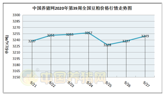 猪价系统数据监测,2020年第39周(2020年09月21日至2020年09月27日)本周豆粕价格整体企稳,全周价格呈现稳中偏强运行态势,全国豆粕价格区间在3228-3249元/吨之间,周初豆粕价格为3237元/吨,周末价格为3249元/吨,全周豆粕价格累计上涨了12元/吨。