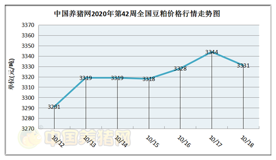 猪价系统数据监测,2020年第42周(2020年10月12日至2020年10月18日)本周豆粕价格走势不稳,行情震荡。全周豆粕价格区间在3291-3344元/吨之间,周初豆粕价格为3291元/吨,周末价格为3331元/吨,全周豆粕价格累计上涨了40元/吨。