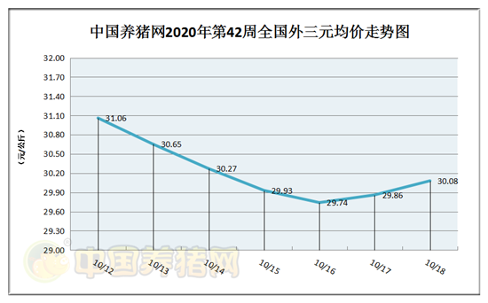 猪价系统数据监测,2020年第42周(2020年10月12日至2020年10月18日)全国外三元生猪价格走势先跌后涨,前半周猪价行情一跌再跌,直至跌破“30元”底线,后半周猪价开始有小涨迹象!猪价行情在29.74-31.06元/公斤区间之内徘徊!周初猪价为31.06元/公斤,周末猪价为30.08元/公斤,全周猪价累计下跌了0.98元/公斤。