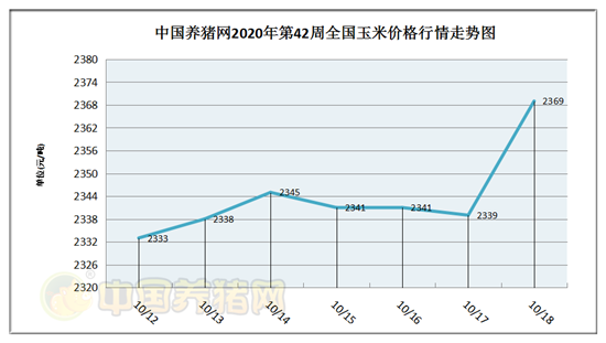 猪价系统数据监测,2020年第42周(2020年10月12日至2020年10月18日)我国玉米行情震荡上涨,期间有小幅下跌走势,全周玉米价格区间在2333-2369元/吨,周初玉米价格为2333元/吨,周末价格为2369元/吨,全周玉米价格累计上涨了36元/吨。