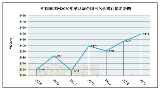 猪价系统数据监测,2020年第43周(2020年10月19日至2020年10月25日)我国玉米行情走势波动较大,周中有大涨大跌走势,全周玉米价格区间在2358-2419元/吨,周初玉米价格为2360元/吨,周末价格为2419元/吨,全周玉米价格累计上涨了59元/吨。