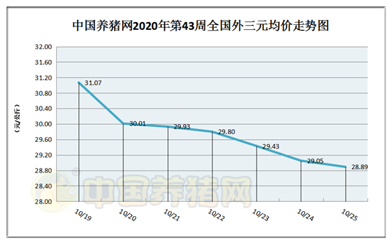 猪价系统数据监测,2020年第43周(2020年10月19日至2020年10月25日)全国外三元生猪价格稳步走跌,价格一路从“31元”跌至“28元”!猪价行情在28.89-31.07元/公斤区间之内徘徊!周初猪价为31.07元/公斤,周末猪价为28.89元/公斤,全周猪价累计下跌了2.18元/公斤。
