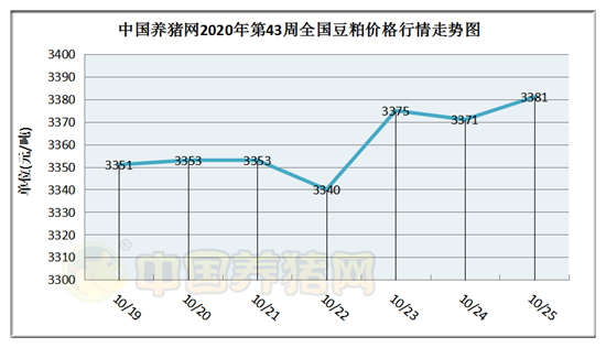 猪价系统数据监测,2020年第43周(2020年10月19日至2020年10月25日)本周豆粕价格走势先稳后涨。全周豆粕价格区间在3340-3381元/吨之间,周初豆粕价格为3351元/吨,周末价格为3381元/吨,全周豆粕价格累计上涨了30元/吨。