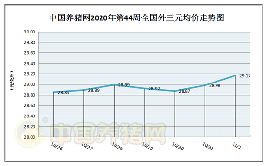 猪价系统数据监测,2020年第44周(2020年10月26日至2020年11月02日)全国外三元生猪价格走势企稳,具体来看本周猪价经历了“涨→跌→涨”的过程,猪价水平也由“28元”涨上了“29元”!周初猪价为28.85元/公斤,周末猪价为29.17元/公斤,全周猪价累计上涨了0.32元/公斤。