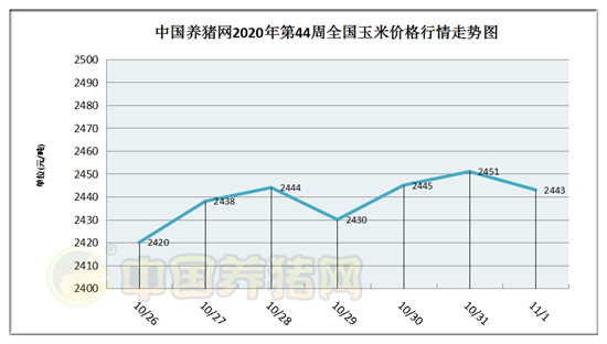 猪价系统数据监测,2020年第44周(2020年10月26日至2020年11月02日)我国玉米行情继续上涨,价格水平大有向2500元/吨上涨的趋势,全周玉米价格区间在2420-2451元/吨,周初玉米价格为2420元/吨,周末价格为2443元/吨,全周玉米价格累计上涨了23元/吨。