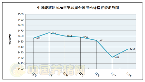 猪价系统数据监测,2020年第45周(2020年11月02日至2020年11月08日)我国玉米行情涨跌互现,下跌走势居多,全周玉米价格区间在2121-2466元/吨,周初玉米价格为2456元/吨,周末价格为2436元/吨,全周玉米价格累计下跌了20元/吨。