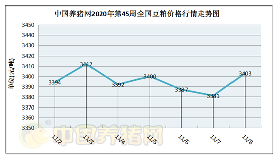 猪价系统数据监测,2020年第45周(2020年11月02日至2020年11月08日)本周豆粕价格走势波动明显,整体行情涨跌互现。全周豆粕价格区间在3381-3412元/吨之间,周初豆粕价格为3394元/吨,周末价格为3403元/吨,全周豆粕价格累计上涨了9元/吨。
