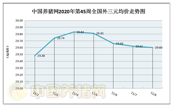 猪价系统数据监测,2020年第45周(2020年11月02日至2020年11月08日)全国外三元生猪价格先涨后跌,整体猪价水平稳定在“29元”!周初猪价为29.48元/公斤,周末猪价为29.60元/公斤,全周猪价累计上涨了0.12元/公斤。