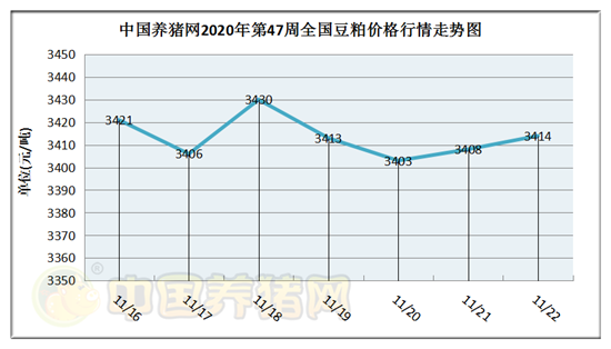猪价系统数据监测,2020年第47周(2020年11月16日至2020年11月22日)本周豆粕价格涨跌互现,整体价格水平没有明显变化。全周豆粕价格区间在3403-3430元/吨之间,周初豆粕价格为3421元/吨,周末价格为3414元/吨,全周豆粕价格累计下跌了7元/吨。