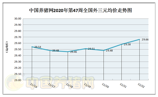 猪价系统数据监测,2020年第47周(2020年11月16日至2020年11月22日)全国外三元生猪价格震荡运行,全周猪价整体上行,本周猪价区间在29.46-29.66元/公斤之间!周初猪价为29.54元/公斤,周末猪价为29.66元/公斤,全周猪价累计上涨了0.12元/公斤。