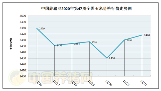 猪价系统数据监测,2020年第47周(2020年11月16日至2020年11月22日)我国玉米行情震荡,周内价格跌势明显。全周玉米价格区间在2430-2479元/吨,周初玉米价格为2479元/吨,周末价格为2468元/吨,全周玉米价格累计下跌11元/吨。