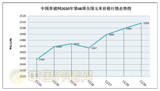 猪价系统数据监测,2020年第48周(2020年11月23日至2020年11月29日)我国玉米价格走势震荡,周后期玉米价格开始稳步上涨。全周玉米价格区间在2448-2508元/吨,周初玉米价格为2448元/吨,周末价格为2508元/吨,全周玉米价格累计上涨了60元/吨。