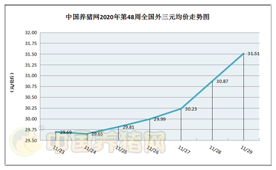 猪价系统数据监测,2020年第48周(2020年11月23日至2020年11月29日)全国外三元生猪价格稳步上涨,周末大涨!本周猪价区间在29.65-31.51元/公斤之间!周初猪价为29.69元/公斤,周末猪价为31.51元/公斤,全周猪价累计上涨了1.82元/公斤。