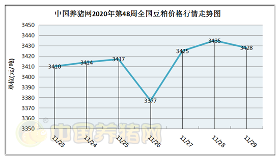 猪价系统数据监测,2020年第48周(2020年11月23日至2020年11月29日)本周豆粕价格涨跌调整,周中豆粕价格出现大幅走跌。全周豆粕价格区间在3377-3435元/吨之间,周初豆粕价格为3410元/吨,周末价格为3428元/吨,全周豆粕价格累计上涨了18元/吨。