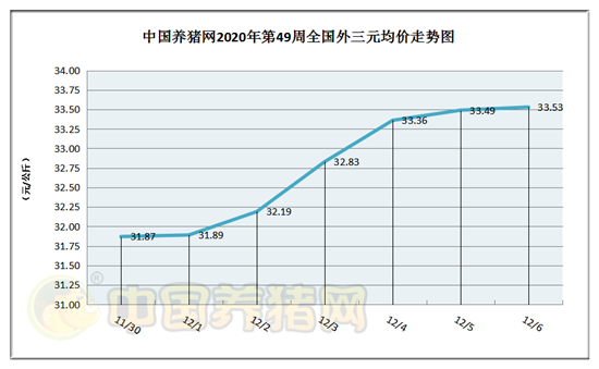 猪价系统数据监测,2020年第49周(2020年11月30日至2020年12月06日)全国外三元生猪价格大幅走涨,周末行情有趋稳迹象!本周猪价区间在31.87-33.53元/公斤之间!周初猪价为31.87元/公斤,周末猪价为33.53元/公斤,全周猪价累计上涨了1.66元/公斤。