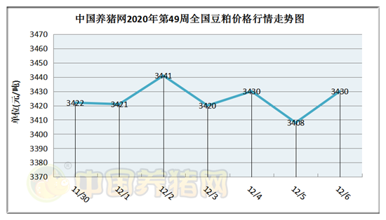 猪价系统数据监测,2020年第49周(2020年11月30日至2020年12月06日)本周豆粕价格波动频繁,全周豆粕价格行情涨跌互现,但周初和周末价格水平没有明显变化。全周豆粕价格区间在3408-3441元/吨之间,周初豆粕价格为3422元/吨,周末价格为3430元/吨,全周豆粕价格累计上涨了8元/吨。