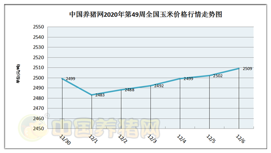 猪价系统数据监测,2020年第49周(2020年11月30日至2020年12月06日)我国玉米价格先跌后涨,周初玉米价格下滑,而后转为稳步上涨。全周玉米价格区间在2483-2509元/吨,周初玉米价格为2499元/吨,周末价格为2509元/吨,全周玉米价格累计上涨了10元/吨。