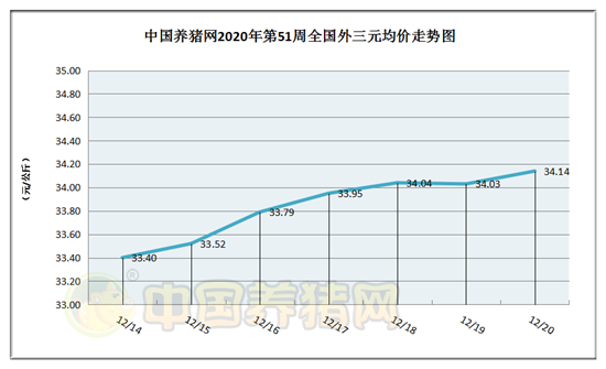 猪价系统数据监测,2020年第51周(2020年12月14日至2020年12月20日)全国外三元生猪价格稳步上行,周六猪价小幅走跌,周日重新上涨!本周猪价区间在33.40-34.14元/公斤之间!周初猪价为33.40元/公斤,周末猪价为34.14元/公斤,全周猪价累计上涨了0.74元/公斤。