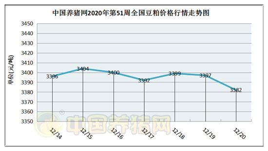 猪价系统数据监测,2020年第51周(2020年12月14日至2020年12月20日)本周豆粕价格行情整体呈现下跌走势,全周行情涨跌互现,但整体下行。全周豆粕价格区间在3382-3404元/吨之间,周初豆粕价格为3396元/吨,周末价格为3382元/吨,全周豆粕价格累计下跌了14元/吨。