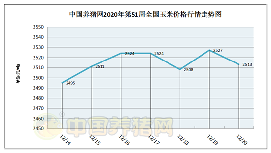 猪价系统数据监测,2020年第51周(2020年12月14日至2020年12月20日)我国玉米价格走势震荡,周前期玉米行情稳步上涨,周后期开始出现波动走势。全周玉米价格区间在2495-2527元/吨,周初玉米价格为2495元/吨,周末价格为2513元/吨,全周玉米价格累计上涨了18元/吨。